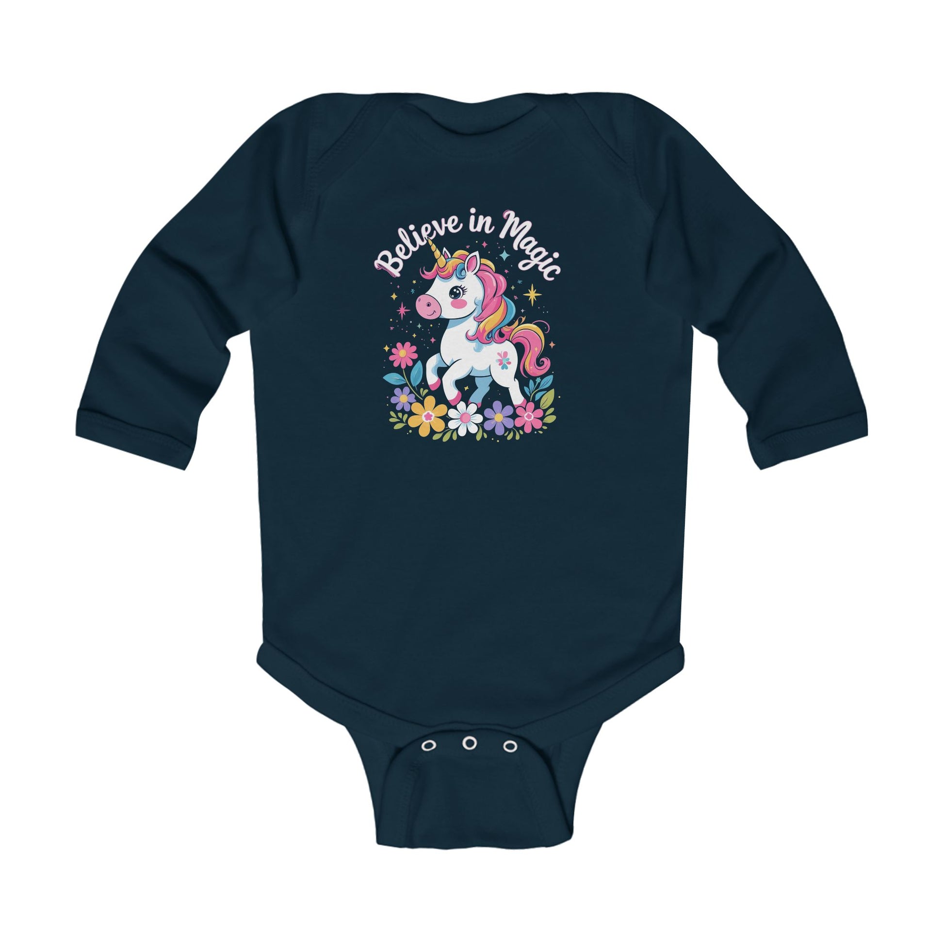 Unicorn "Believe in Magic" Infant Long Sleeve Bodysuit, Navy