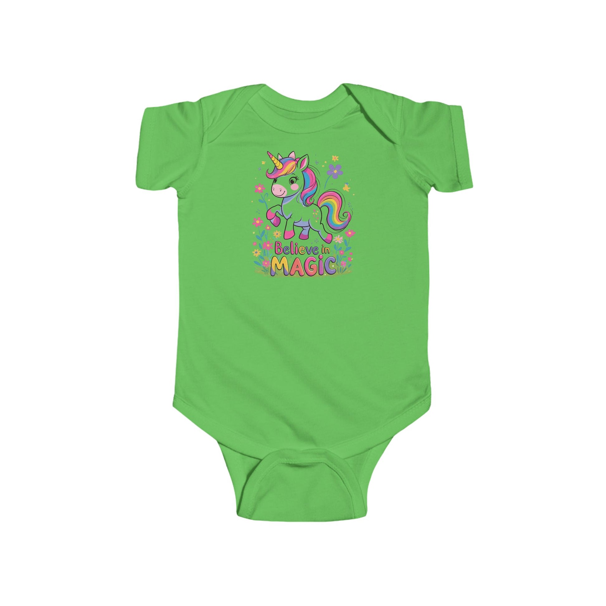 This Unicorn "Believe in Magic" Bodysuit is perfect for infants who love mystical creatures and whimsical designs. It gives off a playful and magical vibe, making it a great gift for baby showers, birthdays, and holidays. Parents looking for cute and unique outfits for their little ones will love this bodysuit and will appreciate its soft fabric, making it gentle on the baby’s skin while being durable enough for their adventures. Perfect for infants who love to show off their personality!